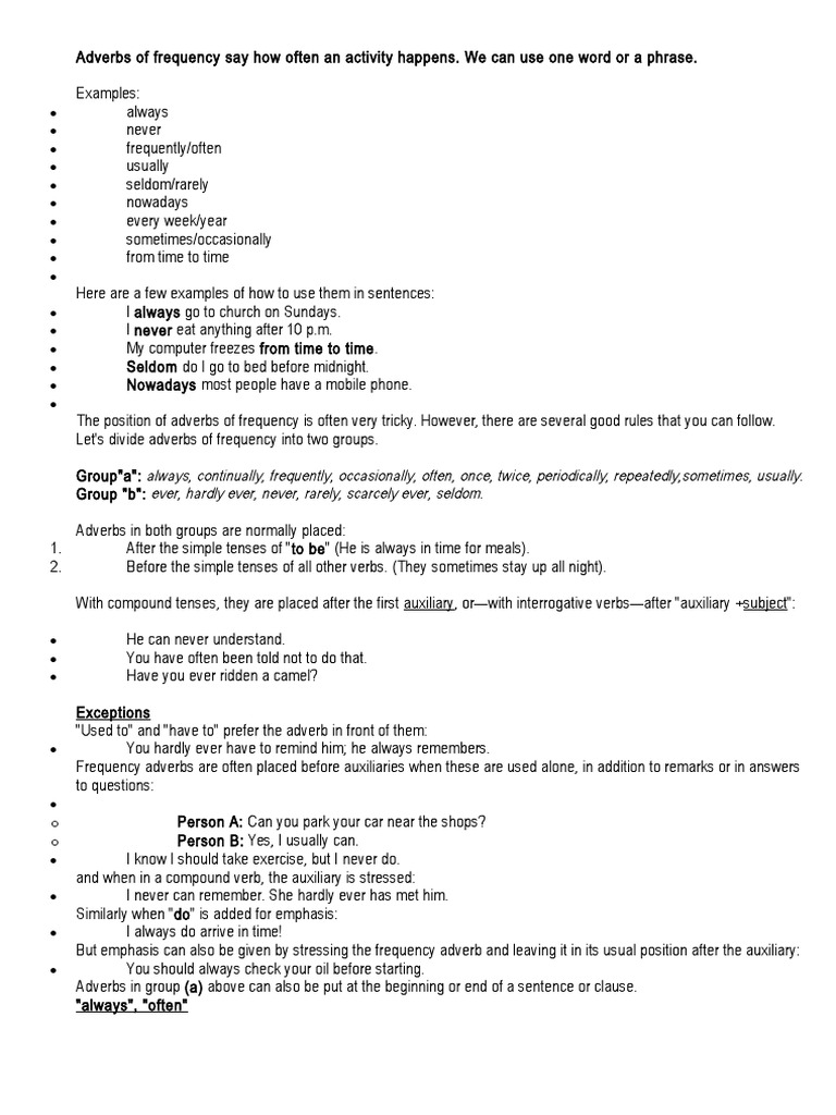 Use the adverb and the correct form of the verbs in brackets. Unit 2 - Exercise 1 - Adverbs of frequency. FREQUENCY ADVERBS exercises 1 - Read online for free.